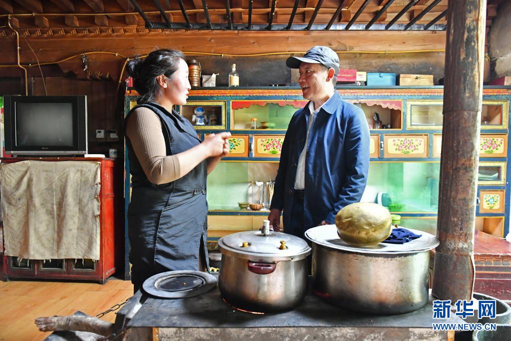 6月28日,广东省援藏干部胡雄英(右)向经营家庭旅馆的藏族群众了解经营情况。新华社记者 孙瑞博 摄