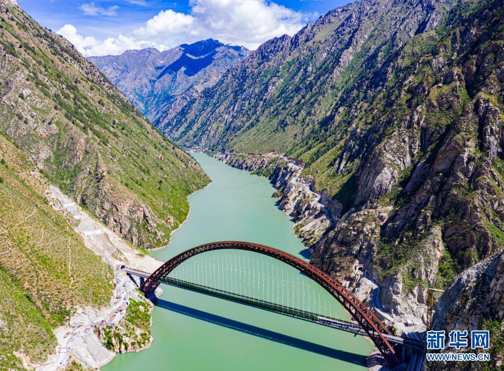 6月17日,试运行的复兴号列车行驶在川藏铁路拉林段藏木特大桥(无人机照片)。新华社记者 普布扎西 摄