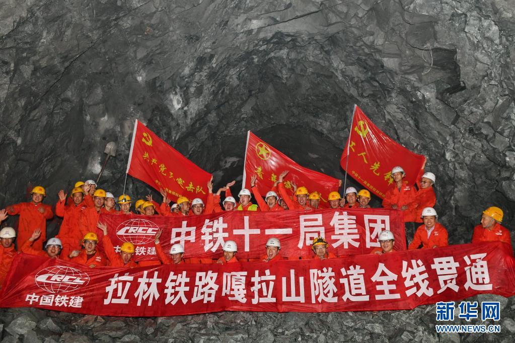 2018年4月7日,中铁十一局施工人员庆祝拉林铁路第一座隧道工程——嘎拉山隧道贯通。新华社记者 张汝锋 摄