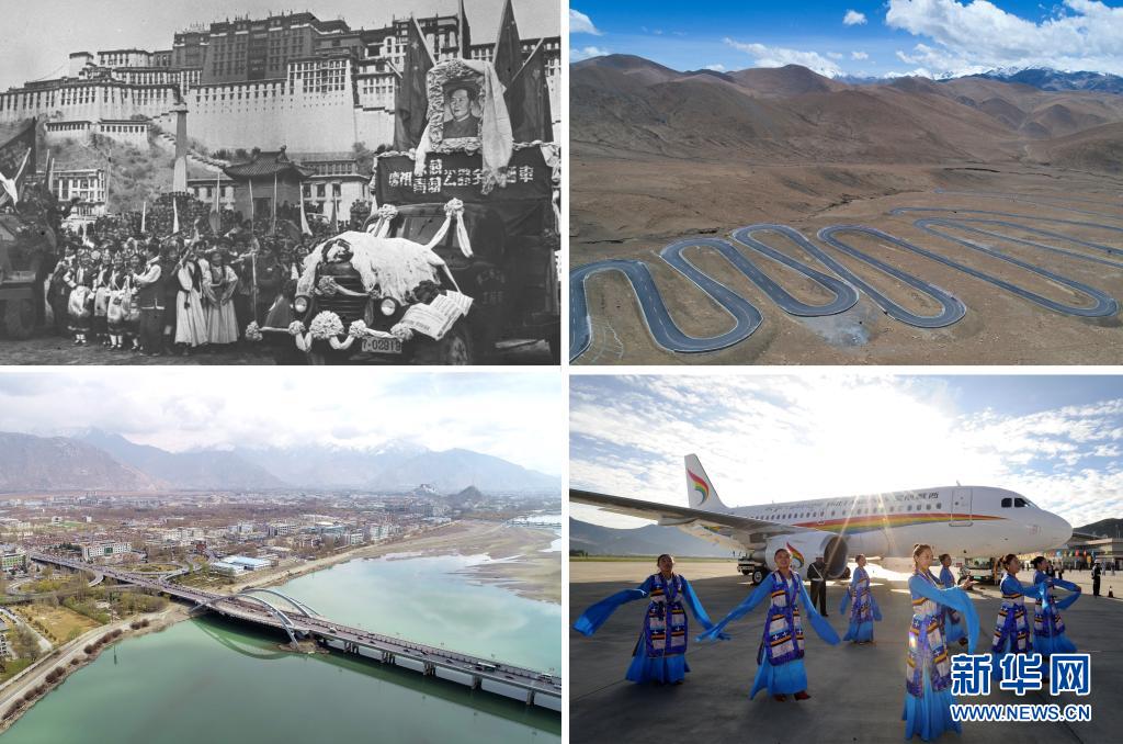 这是一张拼版照片:左上图为1954年12月25日,康藏(今川藏)、青藏两条公路通车仪式在布达拉宫前举行(资料照片);左下图为横跨在拉萨河上的拉萨市区公路(2019年4月3日新华社记者晋美多吉摄,无人机照片);右上图为通往珠峰的公路(2017年5月19日新华社记者普布扎西摄);右下图为西藏航空有限公司成立并举行首航仪式(2011年7月26日新华社记者觉果摄)。新华社发